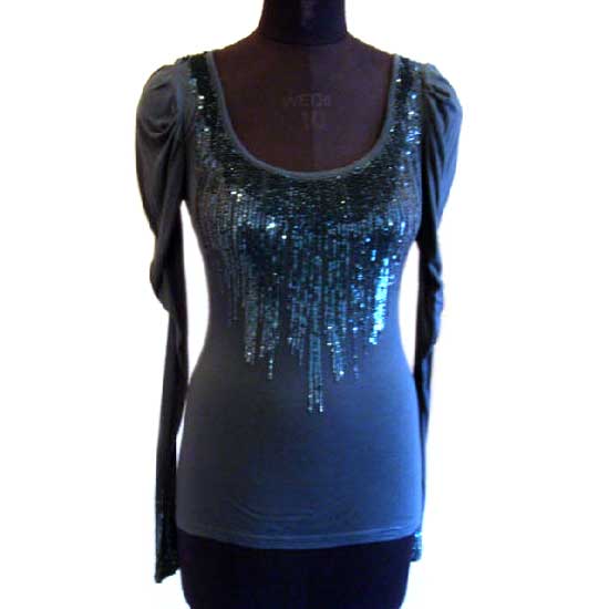 This ladies' T-shirt features long sleeves with subtle pleated details for a sense of elegance. The sophisticated sequin embellishment on the front accents this stunning T-shirt. The classic scoop neckline and skin-tight design highlight this ladies' T-shirt.