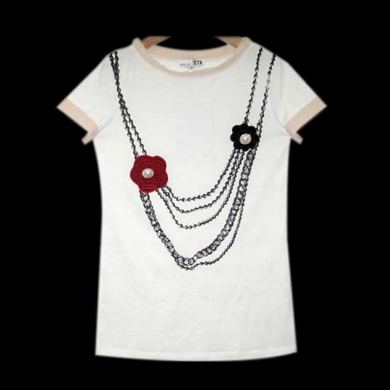 This ladies’ T-shirt comes in clean white with a beige round neck and beige short sleeves. The stylish accessories with floral embellishments on the front lend a chic and elegant touch. This beautiful and unique tee guarantees gratifying wearing comfort.