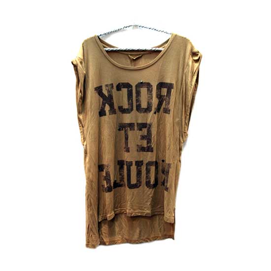 This ladies’ round-neck T-shirt in brown features reversed letters at the front for a characteristic look. The rolled-up wide sleeves and high-low hem also highlight the design. This snug T-shirt is ideal for showcasing your cool side.