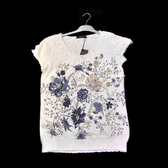 This is a ladies' T-shirt that is finely made of cotton material for excellent wearing comfort. The elegant floral patterns on the front showcase a tasteful touch. The classic round collar and short sleeves are completed with gorgeous trimming.