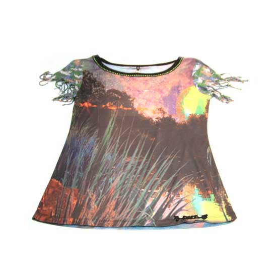 This ladies' t-shirt comes in a fun style with stringed sleeves and a front with a lake view graphic. Made of polyester and cotton, this t-shirt is easy to take care of and durable. Wear this ladies' t-shirt for a weekend gathering with friends.