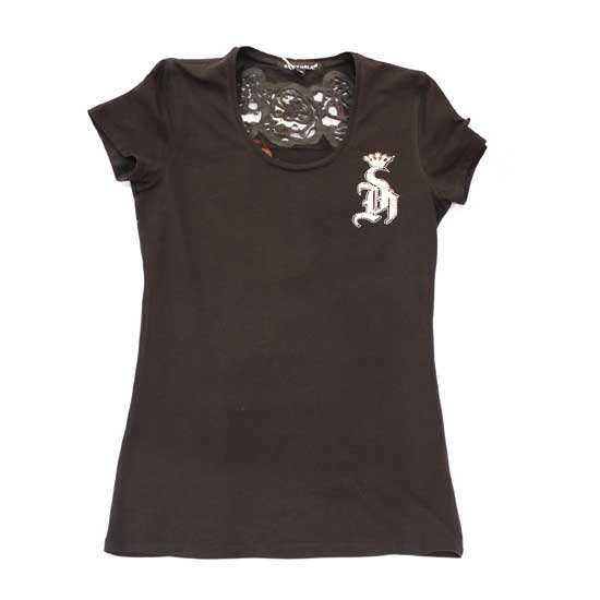 This is a ladies' T-shirt mainly made of cotton with little spandex. It is crafted in a deep color with short sleeveless, a round neckline and a white embellishment on the left front. Its back is printed with golden flower patterns for added charm and glamor.