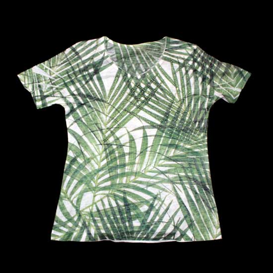 Displayed is a ladies' t-shirt featuring green leaf shaped patterns. Made of polyester and cotton, this t-shirt is soft, breathable and washes easily. This t-shirt is a good choice for a relaxing weekend.