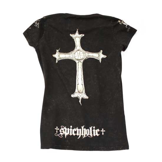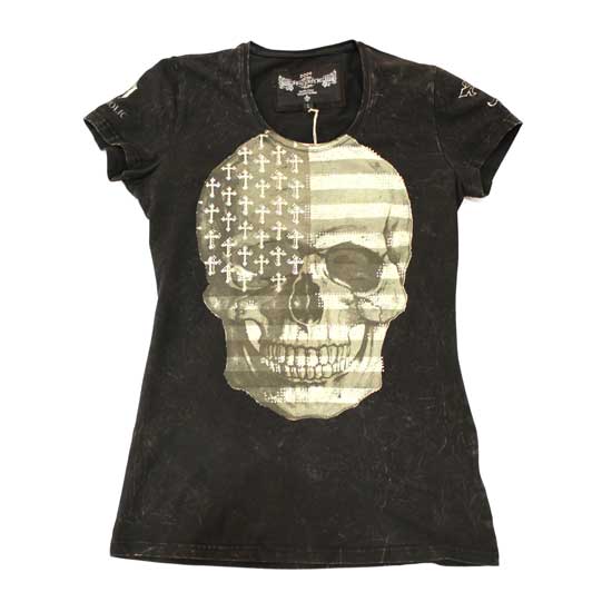 This is a ladies' T-shirt with an attractive and cool look. It is designed in a deep color with a skull print on the front and a cross print on the back. The soft cotton material offers enhanced comfort.