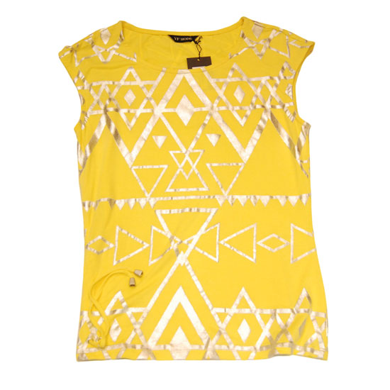 This ladies’ T-shirt comes in bright yellow and gray for an eye-catching look. It is made of quality elastane and viscose for a comfortable touch. This charming T-shirt features short sleeves and a round neck.