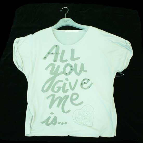 The ladies' short-sleeved tee shirt features stylish printed wordings of “All you give me is…” on the front. The studded details over the letters offer added style. Show your chic summer style in this ladies' T-shirt.