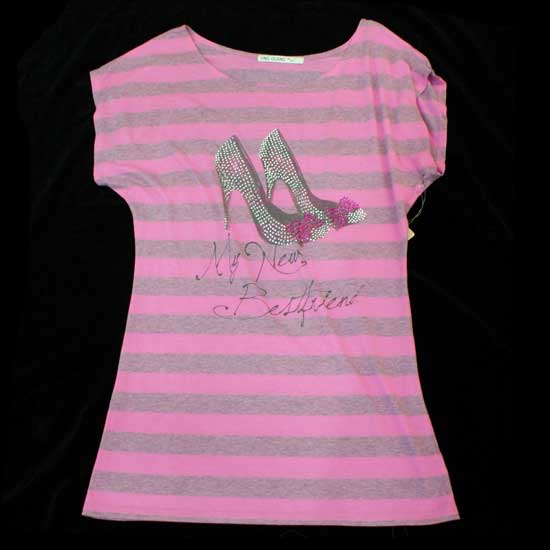 The ladies' T-shirt comes in girlish pink with gray striped patterns. The dainty high-heel pattern in the middle adds a fashionable touch. Show your chic summer style with this ladies' T-shirt.