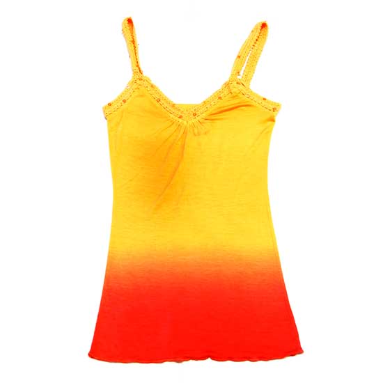 Shown here is a ladies' tank top with a sweetheart neckline and spaghetti straps. The top looks exceptionally cheerful in gradual yellow and red colors. The neck is decorated with hand-crocheted details for style.