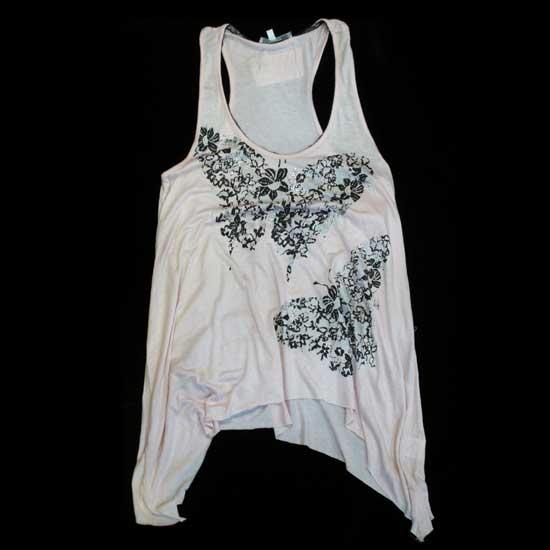 Featured here is a ladies' tank top with attractive butterfly prints. Beads decorate this ladies' tank top and give it a touch of glamour. An irregular arch-shaped hem finishes this stylistic ladies' tank top.