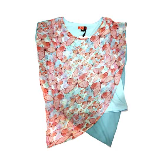 This ladies' tank top features a semi-sheer outer layer with alluring digital prints of butterflies. It is attached with a blue cotton lining for coziness. This asymmetric ladies' top completes your casual look easily.