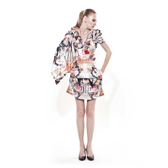 As shown is a ladies' dress with an asymmetrical design. One sleeve features a short puffed style while the other comes as a shawl. The dress boasts colorful strokes with rich ethnic essence. Complete your stylish carefree look with this beautiful dress.