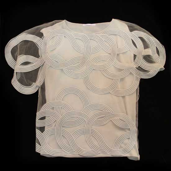 This ladies’ short-sleeve top is designed in a short-sleeve style. The inside is a pure white tank top with a slim cut. The outer layer is made of see-through material with unique curvy patterns.