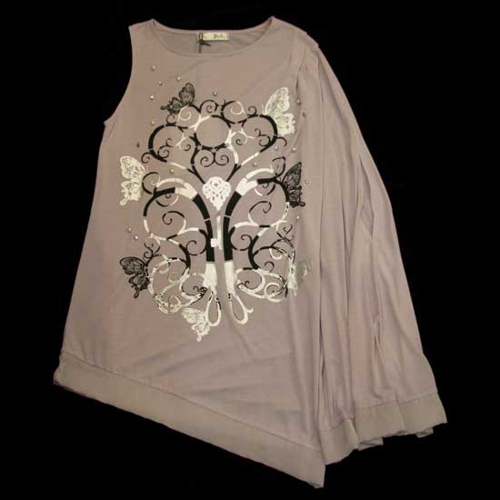 This ladies’ top features a unique cut with one side sleeveless and the other side coming with a long bat sleeve. The diagonal cut at the hem shows additional style. The print at front is adorned with shiny stones for style.