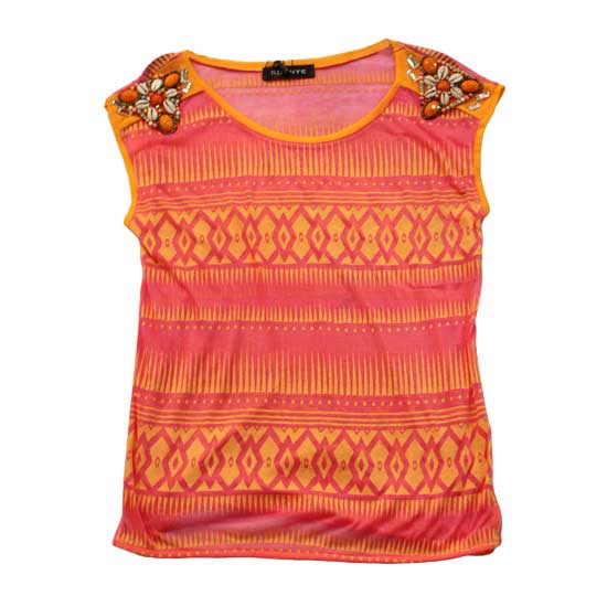 Displayed is a ladies' top made of 100% polyester. Featuring stylish burned-out patterns, this top has shell and bead embellishment. This sleeveless ladies' top is made of high quality for your longer enjoyment.