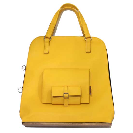 The ladies' tote bag comes with front pockets for business cards and small items. The striking yellow finish offers an attractive appearance while the wooden base offer a touch of uniqueness. Update your wardrobe with this fashionable tote bag.