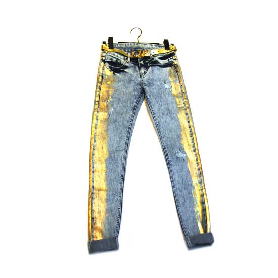 This pair of ladies' trousers comes with a stylish appearance. The two sides of the trousers has a golden color while the center is in gray. The finely manufactured trousers are comfortable to wear.