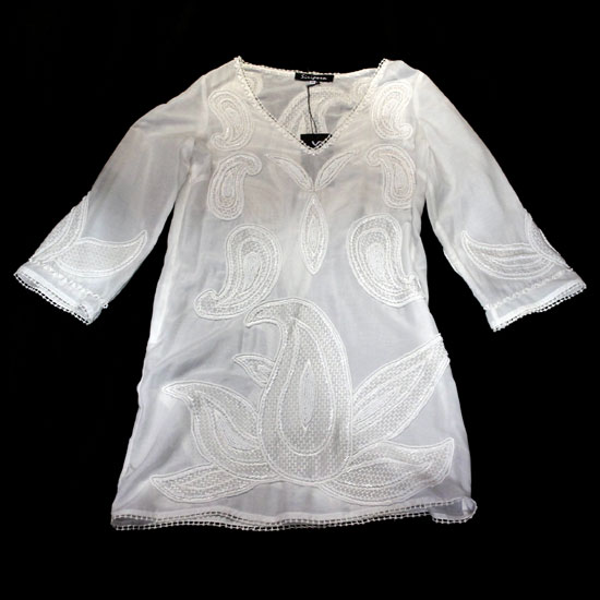 This ladies' silk tunic showcases sophisticated beaded motifs. The classic tunic showcases a V-shaped neck and half-length sleeves. The soft and lightweight silk tunic is extremely comfortable to wear.
