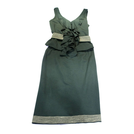 This tasteful ladies' vest and skirt set is perfect for any formal occasion. The vest is accented with draped ruffle details and a waist belt. The calf-length skirt is accented with delicate horizontal lines on the hem.