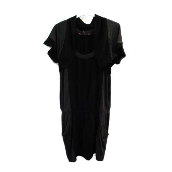 The ladies' dress features a round neckline and cap sleeves. It comes with a waistband and pockets for decorative touch. This dress in plain black color is both chic and office-appropriate.