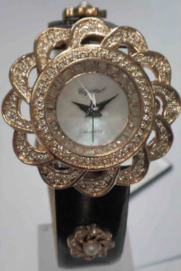 This women’s jewelry watch comes in a splendid flower shaped design. With full clear stone inlaid on bezel and inner rim matching flawlessly with the mop dial, the ladies watch shows off an elegant look. Floral ornaments on the leather band further boosts the look of this exquisitely crafted watch.