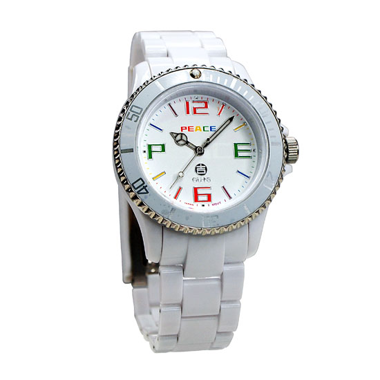 Presented is a watch that impresses eyes with its elegant and refreshing white. This stylish timepiece comes with plastic straps for a light and comfortable fit on the wrist. The colorful hour markings bring a fun twist for the piece.