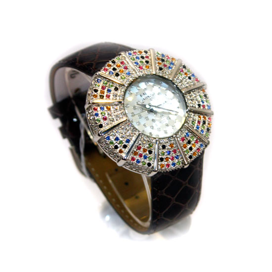 Pictured is a watch with a design suggesting modern elegance. The round, large bezel is decorated with colored CZ stones for a dazzling style. The genuine leather strap ensures comfort on the wrist.