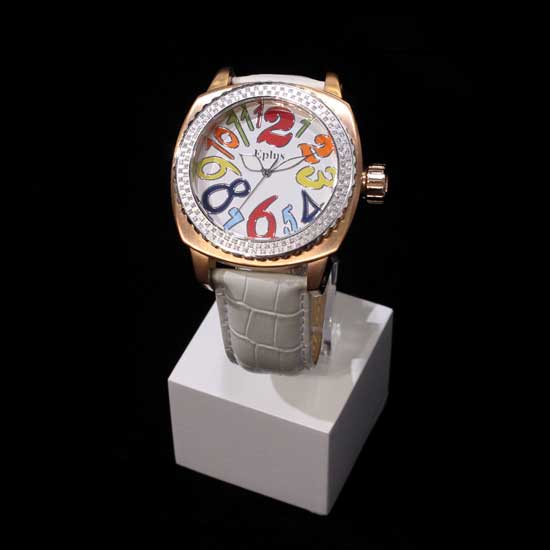 This ladies' quartz analog watch comes with a golden watch case and an eye-catching bezel, which grabs people's attention easily. The dial, with colorful Arabic numerals, add a cute touch to this stylish watch. It is completed with white straps that are made of quality leather to offer added comfort to the wrist.