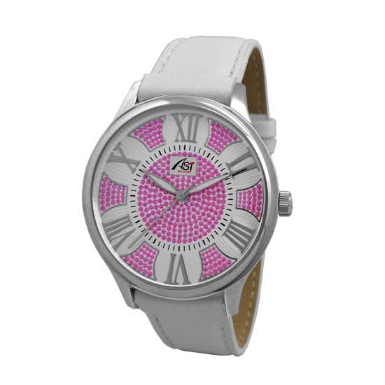 This is an elegant ladies' watch that is meticulously designed with a stainless steel case and a genuine leather strap. With three hands and a Roman numeral display, the watch dial is also accented with pink-tone beads for a decorative touch. This stylish watch boasts a high-precision movement.