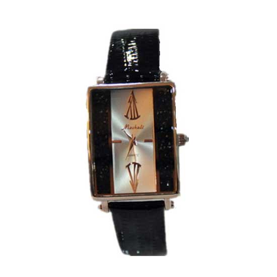 This is a ladies' watch with a fashionable and trendy design. It features a rectangular case in black with silvery rims. The contrasting dial is crafted with two artistic Roman numbers and two stick markers at 3-6-9-12 o'clock. The watch is completed with a pair of leather straps in black for a perfect finish.