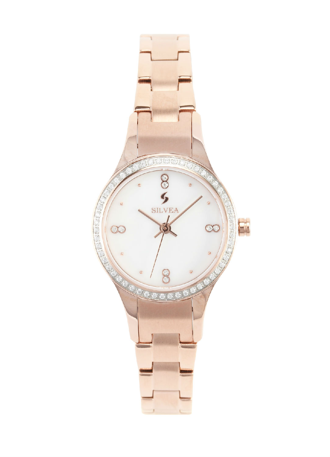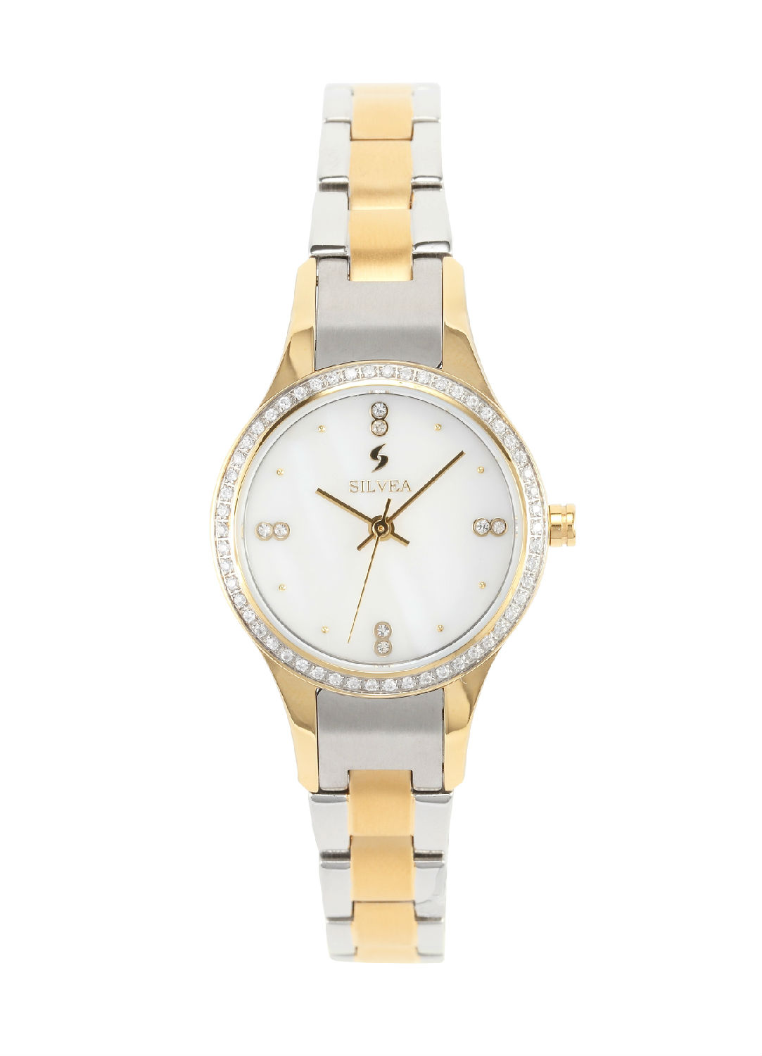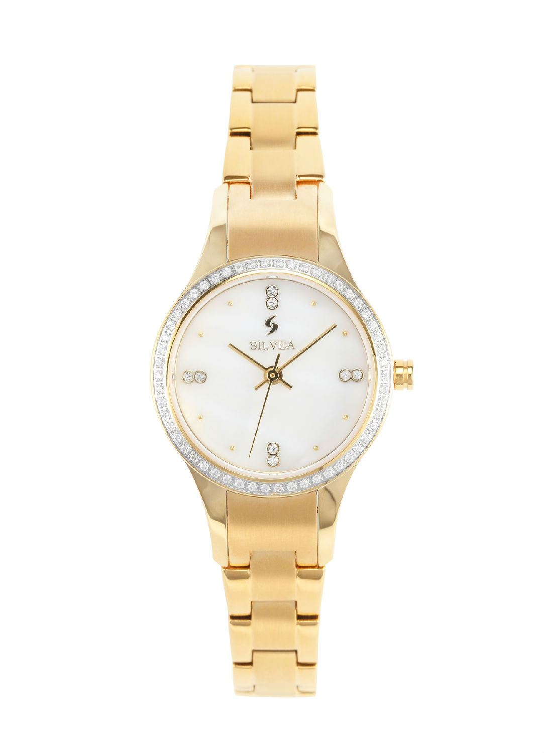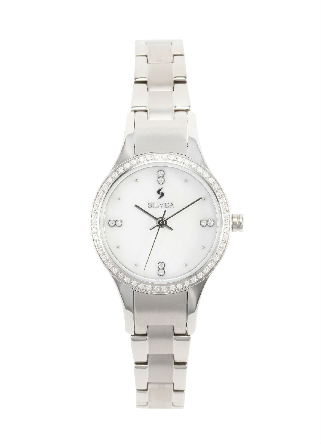 This stunning piece flaunts a sleek stainless steel case with a beautiful MOP dial for a natural pearlescent shimmer. Set around with a gemstone border, it adds sparkles on your wrist effortlessly. Being moisture-resistant and time accurate in quartz movement, it is designed with functionality at the same time. Add a touch of elegance to your style with this watch.