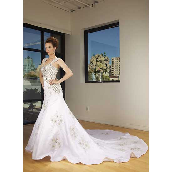 The ladies' wedding dress has a stripe-pattern bodice and a floral-pattern bottom. The flared dress bottom makes you move gracefully when you walk in it. This stunning dress will definitely make you look super-gorgeous on your big day.