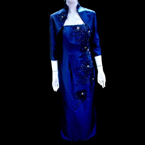 This ladies’ blue hued satin dress is ideal for wedding wear. The crystal beads and floral decorations highlight this chic and sleek dress. This elegant and fashionable dress looks gorgeous with a translucent hat.