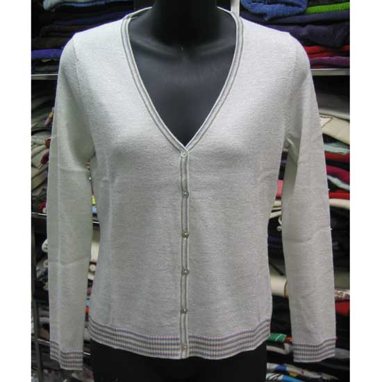 The ladies' cardigan features a V neckline and button placket. The contrasting stripe patterns on the neckline, sleeves and hemline add a touch of style. This soft and warm cardigan serves as an excellent layering item.