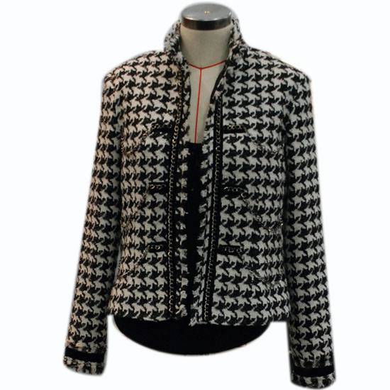 The ladies' jacket flaunts houndstooth patterns for subtle elegance. It comes with decorative chains for added class and style. This wool jacket is a great choice for your fall wardrobe.