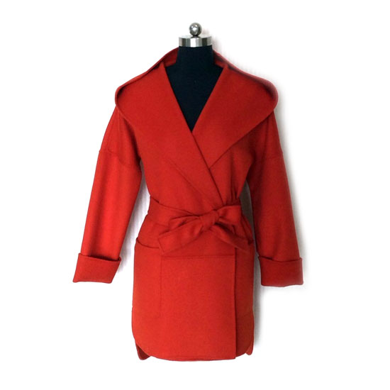 This ladies’ jacket is designed in bright red for an eye-catching look. It is made of 100% wool to ensure wearing comfort and warmth. This elegant jacket comes with a waist belt to adjust different fits.