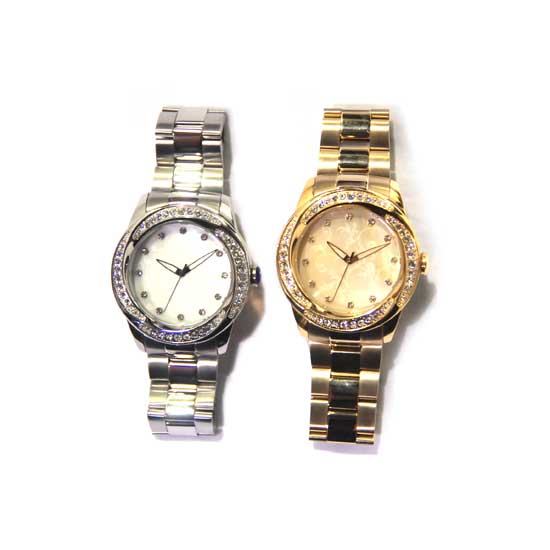 This finely manufactured quartz analog watch precisely indicates the time. The exquisite watch features a glossy surface and is fitted with shiny Swarovski crystals. The dial of the timepiece is made of mother of pearl.