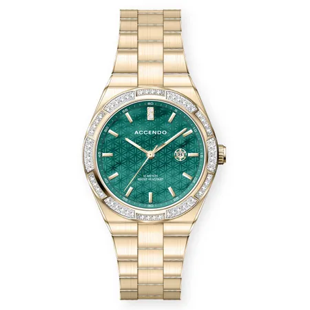 Stainless steel IPG case with crystals, 3 ATM water-resistant, stainless steel IPG solid band, green dial, Japan movement.