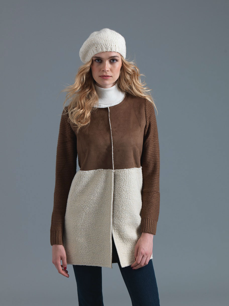 This simply elegant paneled longline coat will never go out of style while keeping wearers warm in deep winters. The contemporary design spotlights a brilliant combination of textures for a sophisticated appeal—long knit sleeves with ribbed cuffs, suede-like bodice and cozy shearling texture below an empire waistline.