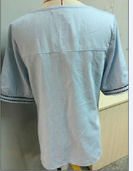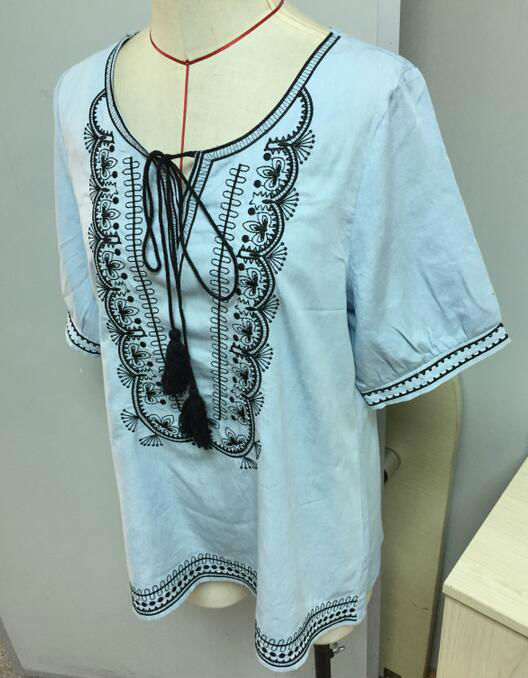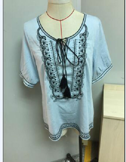 Complete your summer look with a touch of boho chic in this denim-looking shirt. It flaunts contrasting embroidered details along the neckline, sleeve edges and hem for a striking appearance. Featuring a tie front, loose fit and hip-length design, this easy-to-match shirt is perfect to be paired with your favorite shorts and sandals to hit up the flea market or beach.