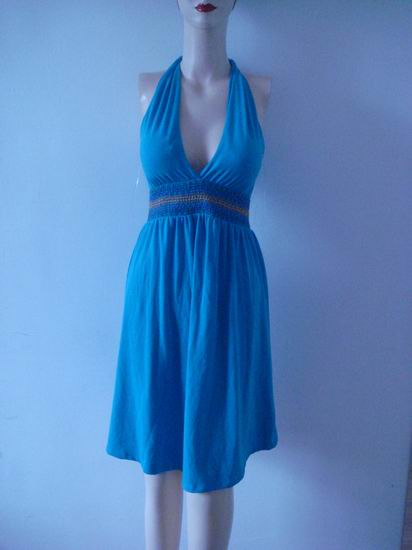 Step into style with this light blue dress. It features an illusion bodice and an empire waist with ruche creating the image of slim and slender. It ties comfortably behind your neck.