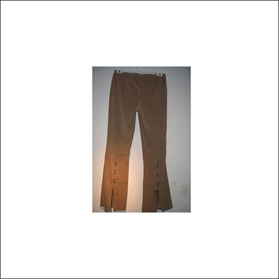 • Pant that is brown with strings tying the bottom of the pant