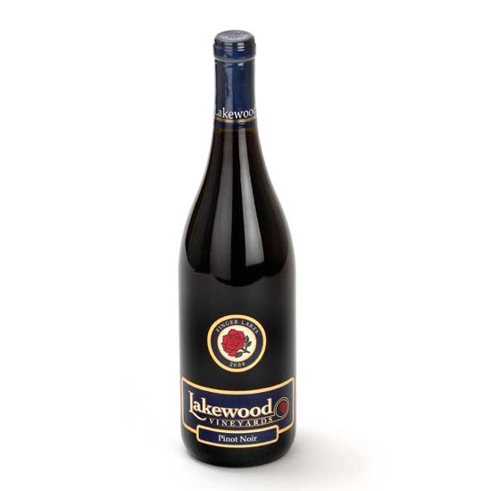 Displayed is a bottle of Pinot Noir that originates from the Finger Lakes, USA. Oaked and bottled for 14 months, this red wine has a bright cherry nose with earthy flavors. This wine is delicate yet complex, making it a piece of art on your dining table.