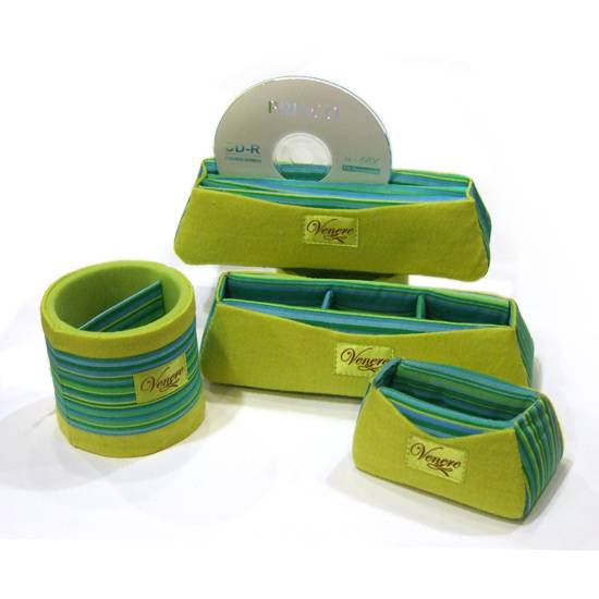 These laminated felt stationery include pen stand, pencil case and stationery organizer. They have horizontal stripe patterns. Logos are stitched up on one side.