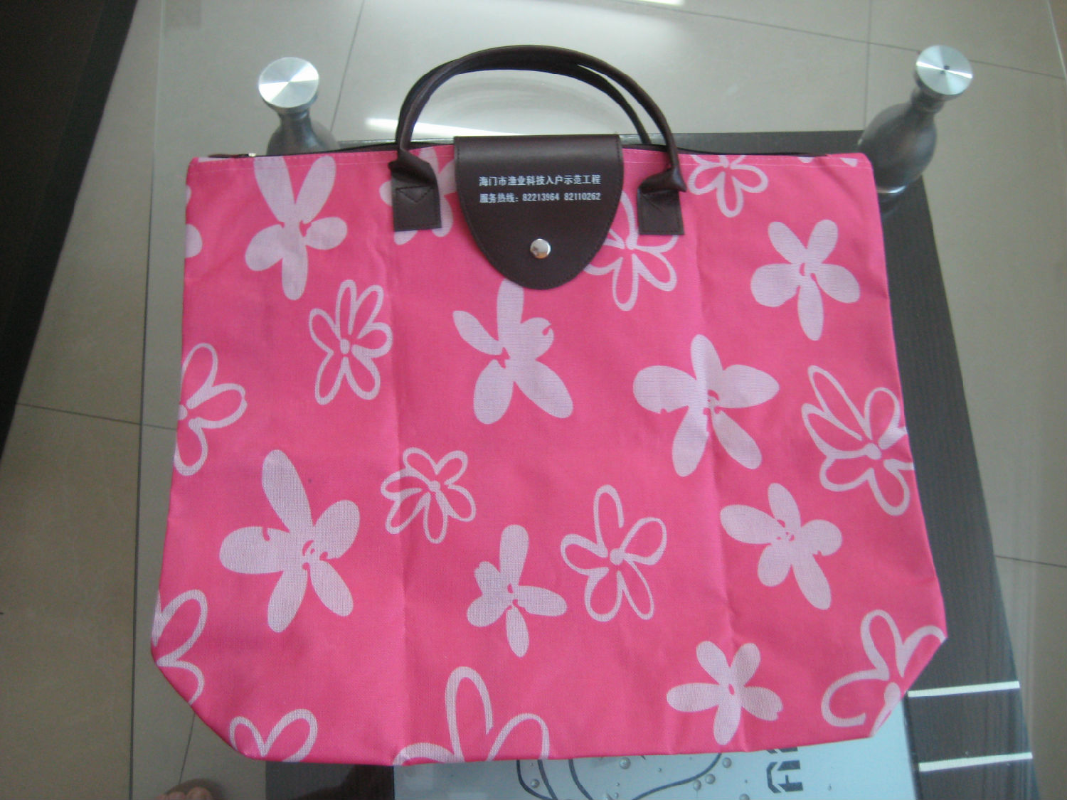 This laminated shopping bag features a multi-color exterior. The shopping bags can be printed with customized logos for promotional use. Two transparent top handles complete the style of this shopping bag.