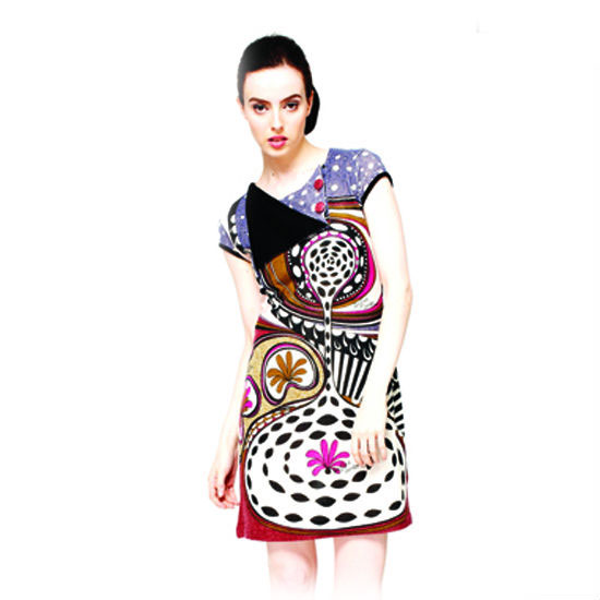 This lovely one-piece dress is designed by Pam & Arch London. The bright-hued print is a vivid illustration of an artist’s impression of a stunning, graphic landscape. The round open back comes with a distinctive pom-pom tie.