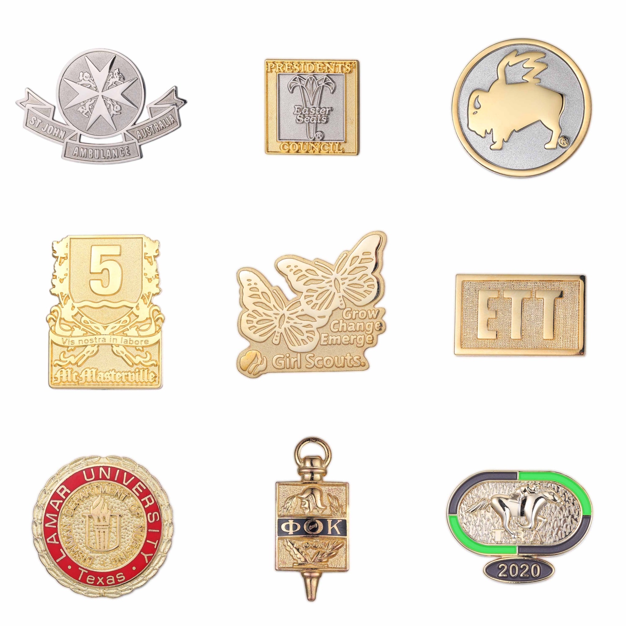 These are lapel pins that have different shapes, logos and portriats. They are usually made of metals.Customized design is available upon customers' request.
