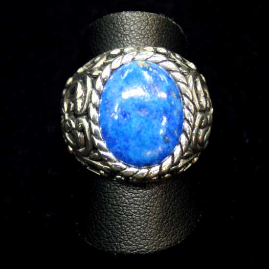 The carved sterling silver boasts a polished oval lapis lazuli with amazing hues. The carved patterns on the band give a vintage look. It looks simply enticing and goes well with evening wear.