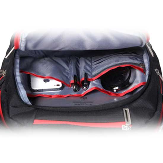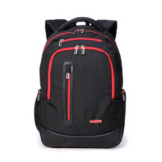 This chic backpack in black and red is suitable for carrying 15.6” laptops. It comes with multiple pockets inside, allowing you to carry your phone, pens and cables in a tidy way. This heavy-duty laptop backpack is made of jacquard nylon.