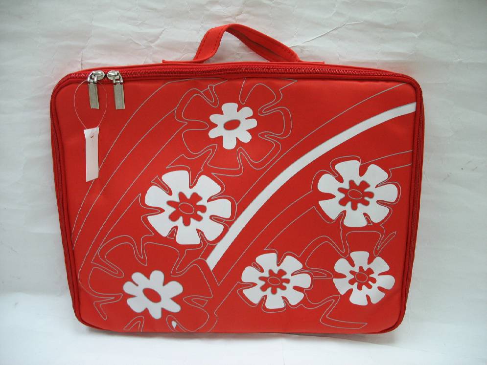 Introduced is a bright red laptop bag, suggesting a hint of liveliness with white flower adornments. The rectangular compartment is configured with double zipper pullers for convenient opening. The top showcases a strap grab handle which bestows snug and handy carrying.