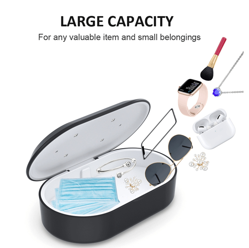 Any smartphone or cell phone up to 6.5 inches(including the biggest iPhone, Sumsung models) can fit in the UV phone cleaner. What’s more, you can also place your masks, glasses, jewelry, watches, car keys, earpods inside the box to get a complete disinfecting bath.